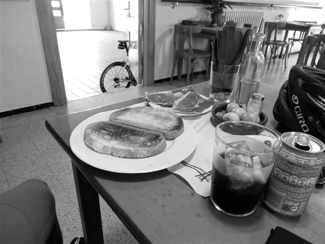 Llevo ya casi 200km y desde lo alto del Coll de Canes que sólo he comido una barrita así que el cuerpo lo empieza a notar. A mi paso por Sant Martí, encuentro un bar abierto regentado por un hombre muy simpático con el que entablo un poco de conversación. Le pido un bocadillo de jamón para ir rápido….