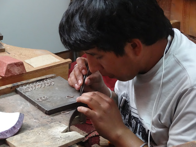 Otra cosa por la que son famosos aquí es por como trabajan la plata y la pureza de la misma. Visitamos un taller y la joyería. Arduo trabajo el de estar buscando, limpiando, ensartando...Todo el día postrados en esas sillas y bajo esa pequeña lámpara manteniendo siempre las manos empapadas mientras liman y liman cuidadosamente.