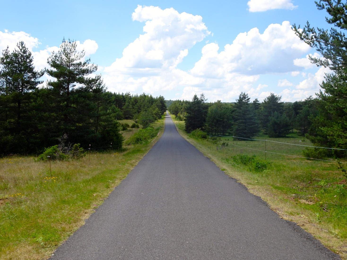 Al llegar arriba, cruce de 4 carreteras por la que apareceremos en unas horas otra vez. Ahora, hacemos un giro de 180º y nos vamos por una carreterucha como si fuésemos de vuelta al pueblo, pero por encima de la loma. Menudo cambio de carretera. Ahora andamos aún más solos y por un terrenos que parece que estemos muy alejados de todo. Estamos de lleno en la Reserva de la Biosfera de Cévennes. Auténticos fondos de escritorio de Windows...